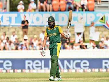 आयरलैंड के खिलाफ पहले बल्लेबाजी करने उतरी दक्षिण अफ्रीकी टीम को क्विंटन डी कॉक के विकेट के रूप में 12 रन के स्कोर पर करारा झटका लगा था लेकिन हाशिम अमला ने संयम से खेलते हुए अपनी पारी को आगे बढ़ाया और फाफ डु प्लेसी के साथ एक बड़ी साझेदारी को अंजाम तक पहुंचाया। अमला ने ठीक 100 गेंदों पर अपना शतक पूरा किया जिस दौरान उन्होंने 9 चौके और 2 छक्के जड़े। इसके साथ ही उन्होंने डु प्लेसी के साथ दूसरे विकेट के लिए 247 रन की रिकॉर्ड साझेदारी को भी अंजाम दिया। ये इस विश्व कप में हाशिम अमला का पहला शतक है। पिछले मुकाबले में उन्होंने अर्धशतक जड़ते हुए 65 रनों की पारी खेली थी।